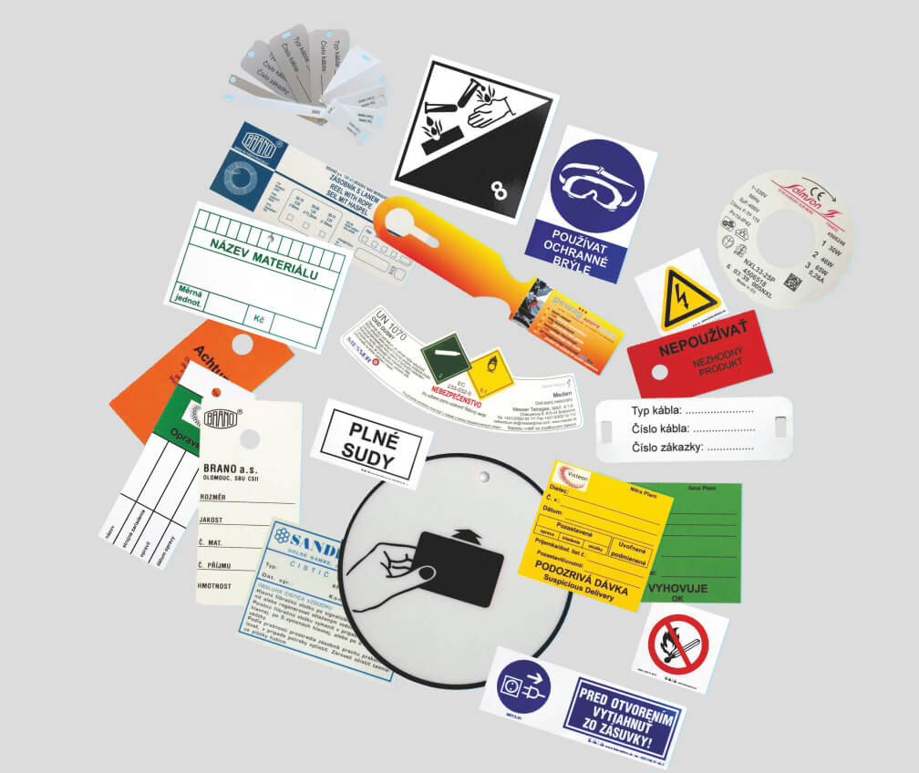 Anyag - PVC, polipropilén, polisztirol, hPS, különböző megjelenésű és vastagságú poliészter. A műanyag címkék beszállításra kerülhetnek, mint öntapadó címkék is.